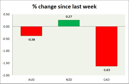 Strength meter (since last week) - Aussie -0.38%, Kiwi +0.27%, Loonie -1.63%.