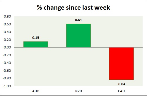 Strength meter (since last week) - Aussie +0.15%, Kiwi +0.61%, Loonie -0.84%.