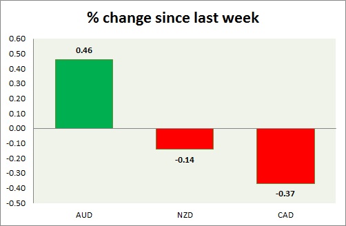 Strength meter (since last week) - Aussie +0.46%, Kiwi -0.14%, Loonie -0.37%