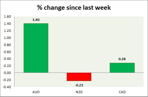 Strength meter (since last week) - Aussie +1.40%, Kiwi -0.23%, Loonie +0.28%
