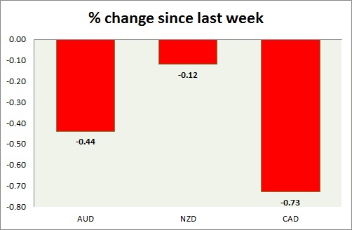 Strength meter (since last week) - Aussie -0.44%, Kiwi -0.12%, Loonie -0.73%