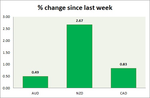 Strength meter (since last week) - Aussie +0.49%, Kiwi +2.67%, Loonie +0.83%