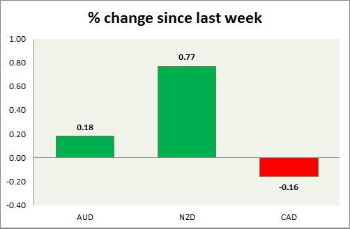 Strength meter (since last week) - Aussie +0.18%, Kiwi +0.77%, Loonie -0.16%