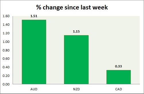 Strength meter (since last week) - Aussie +1.51%, Kiwi +1.15%, Loonie +0.33%