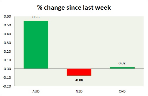 Strength meter (since last week) - Aussie +0.55%, Kiwi -0.08%, Loonie +0.02%