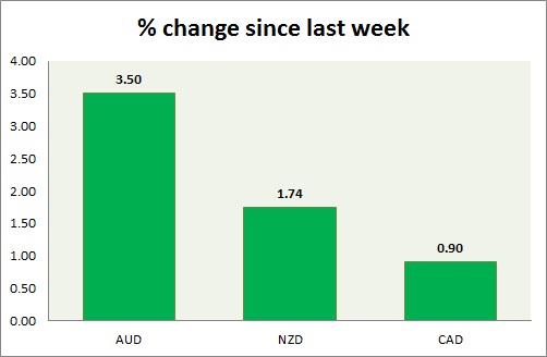 Strength meter (since last week) - Aussie +3.50%, Kiwi +1.74%, Loonie +0.90%