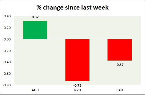 Strength meter (since last week) - Aussie +0.32%, Kiwi -0.73%, Loonie -0.37%