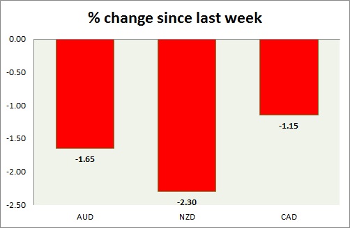 Strength meter (since last week) – Aussie -1.65%, Kiwi -2.30%, Loonie -1.15%