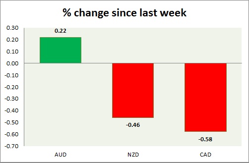 Strength meter (since last week) – Aussie +0.22%, Kiwi -0.46%, Loonie -0.58%