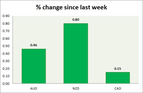 Strength meter (since last week) – Aussie +0.46%, Kiwi +0.80%, Loonie +0.15%