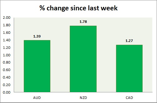 Strength meter (since last week) – Aussie +1.39%, Kiwi +1.78%, Loonie +1.27%