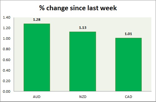 Strength meter (since last week) – Aussie +1.28%, Kiwi +1.13%, Loonie +1.01%