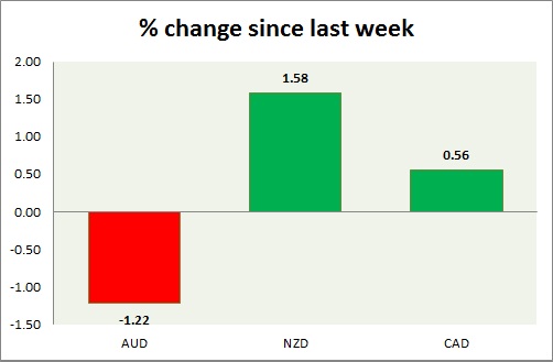 Strength meter (since last week) – Aussie -1.22%, Kiwi +1.58%, Loonie +0.56%