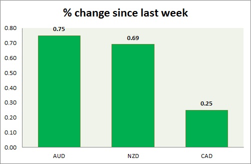 Strength meter (since last week) – Aussie +0.75%, Kiwi +0.69%, Loonie +0.25%