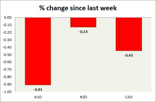 Strength meter (since last week) – Aussie -0.91%, Kiwi -0.13%, Loonie -0.45%