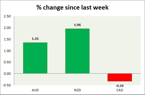Strength meter (since last week) – Aussie +1.35%, Kiwi +1.96%, Loonie -0.34%