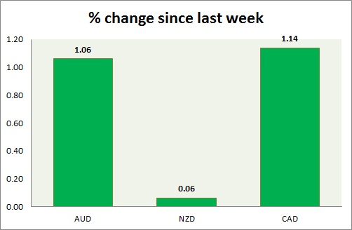 Strength meter (since last week) – Aussie +1.06%, Kiwi +0.06%, Loonie +1.14%