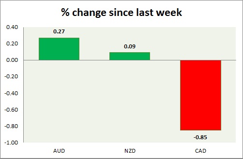 Strength meter (since last week) – Aussie +0.27%, Kiwi +0.09%, Loonie -0.85%