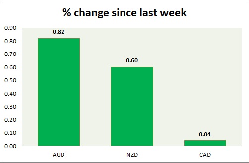 Strength meter (since last week) – Aussie +0.82%, Kiwi +0.60%, Loonie +0.04%