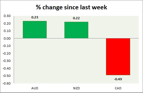 Strength meter (since last week) – Aussie +0.23%, Kiwi +0.22%, Loonie -0.49%