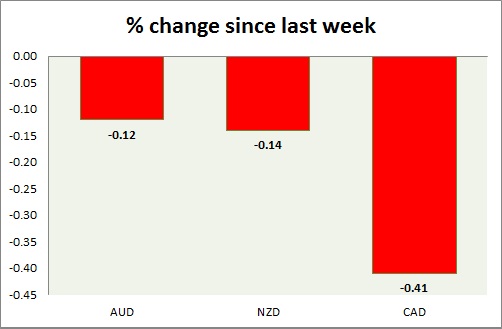 Strength meter (since last week) – Aussie -0.12%, Kiwi -0.14%, Loonie -0.41%