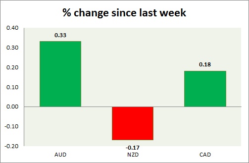 Strength meter (since last week) – Aussie +0.33%, Kiwi -0.17%, Loonie +0.18%