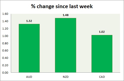 Strength meter (since last week) – Aussie +1.32%, Kiwi +1.48%, Loonie +1.02%