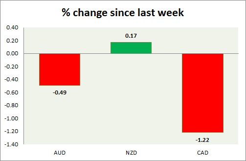 Strength meter (since last week) – Aussie -0.49%, Kiwi +0.17%, Loonie -1.22%