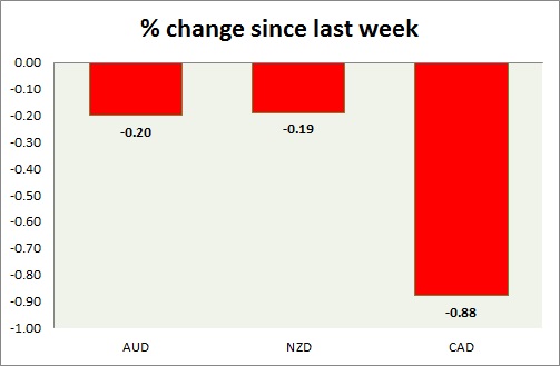 Strength meter (since last week) – Aussie -0.20%, Kiwi -0.19%, Loonie -0.88%