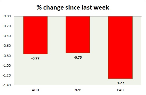 Strength meter (since last week) – Aussie -0.77%, Kiwi -0.75%, Loonie -1.27%