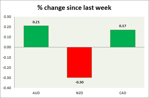 Strength meter (since last week) – Aussie +0.21%, Kiwi -0.30%, Loonie +0.17%