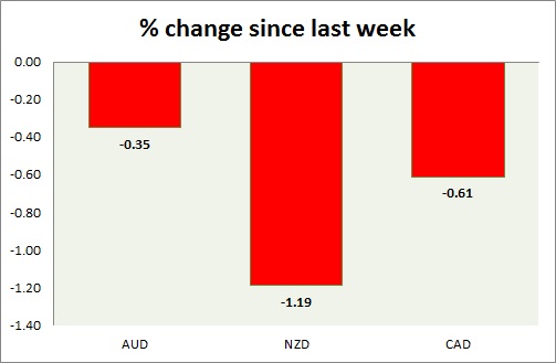 Strength meter (since last week) – Aussie -0.35%, Kiwi -1.19%, Loonie -0.61%