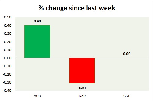 Strength meter (since last week) – Aussie +0.40%, Kiwi -0.31%, Loonie -0.00%