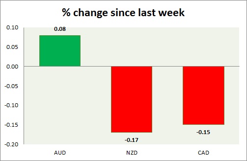 Strength meter (since last week) – Aussie +0.08%, Kiwi -0.17%, Loonie -0.15%