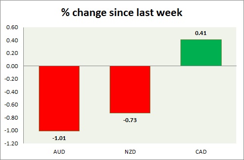 Strength meter (since last week) – Aussie -1.01%, Kiwi -0.73%, Loonie +0.41%
