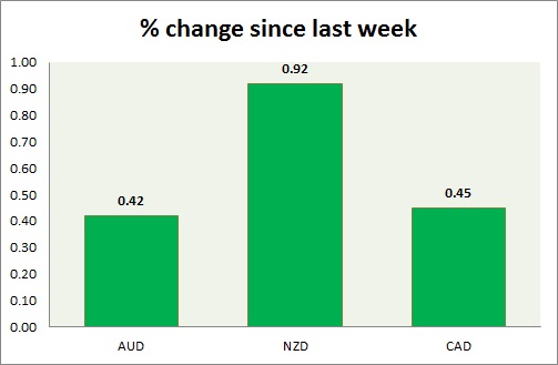 Strength meter (since last week) – Aussie +0.42%, Kiwi +0.92%, Loonie +0.45%