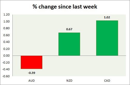 Strength meter (since last week) – Aussie -0.39%, Kiwi +0.67%, Loonie +1.02%