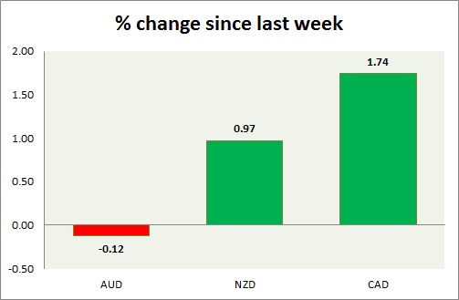 Strength meter (since last week) – Aussie -0.12%, Kiwi +0.97%, Loonie +1.74%