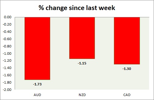 Strength meter (since last week) – Aussie -1.34%, Kiwi -0.96%, Loonie -1.39%