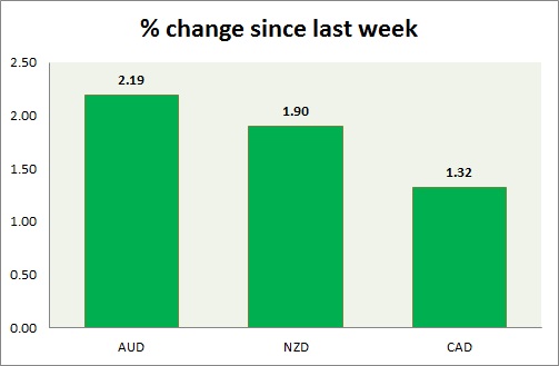 Strength meter (since last week) – Aussie +2.19%, Kiwi +1.90%, Loonie +1.32%
