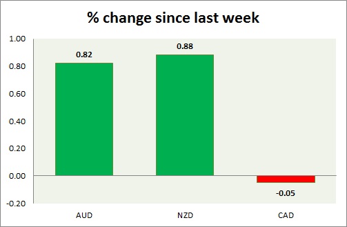 Strength meter (since last week) – Aussie +0.82%, Kiwi +0.88%, Loonie -0.05%