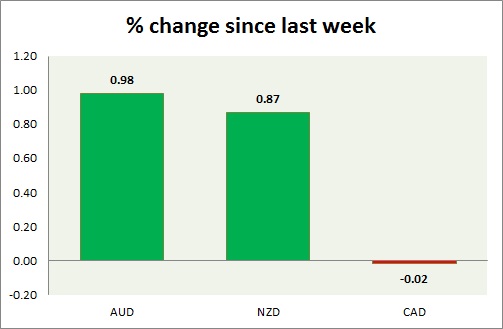 Strength meter (since last week) – Aussie +0.98%, Kiwi +0.87%, Loonie -0.02%
