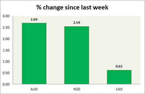 Strength meter (since last week) – Aussie +2.69%, Kiwi +2.54%, Loonie +0.62%