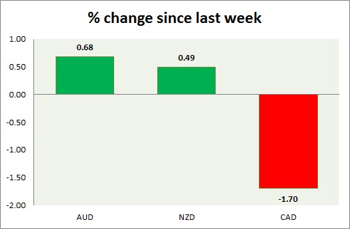 Strength meter (since last week) – Aussie +0.68%, Kiwi +0.49%, Loonie -1.70%