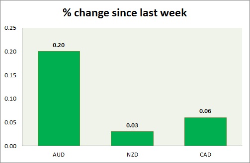 Strength meter (since last week) – Aussie +0.20%, Kiwi +0.03%, Loonie +0.06%