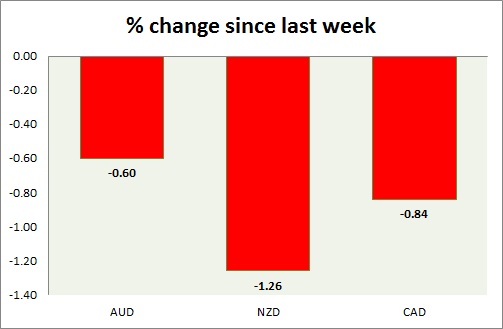 Strength meter (since last week) – Aussie -0.60%, Kiwi -1.26%, Loonie -0.84%