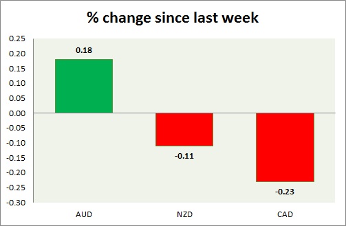 Strength meter (since last week) – Aussie +0.18%, Kiwi -0.11%, Loonie -0.23%