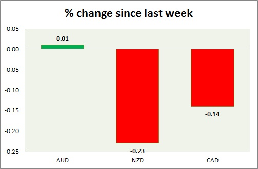 Strength meter (since last week) – Aussie +0.01%, Kiwi -0.23%, Loonie -0.14%