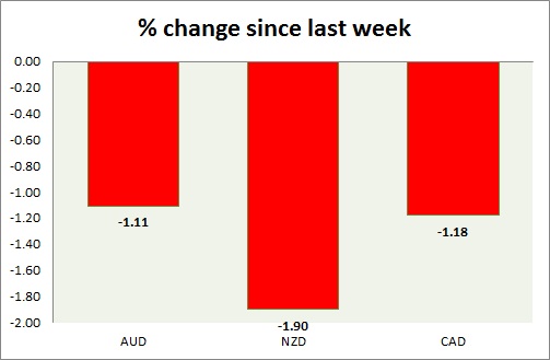 Strength meter (since last week) – Aussie -1.11%, Kiwi -1.90%, Loonie -1.18%