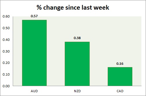 Strength meter (since last week) – Aussie +0.57%, Kiwi +0.38%, Loonie +0.16%